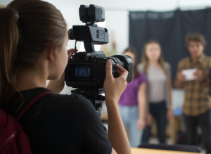 Fase 5 – Riprese, montaggio e una sorpresa inaspettata. I ragazzi hanno girato le scene e proceduto al montaggio con iMovie, utilizzando CapCut Pro per la tutela della privacy (oscuramento dei volti). In questa fase è arrivato il momento più emozionante dell'intero percorso: E. si è proposto spontaneamente come voce narrante del cortometraggio. Non solo: soddisfatti e lanciati, i ragazzi hanno deciso di porsi una sfida ulteriore, inserendo nel cortometraggio una sequenza in LIS (Lingua Italiana dei Segni), un gesto di apertura e inclusione che ha commosso tutta la comunità scolastica.